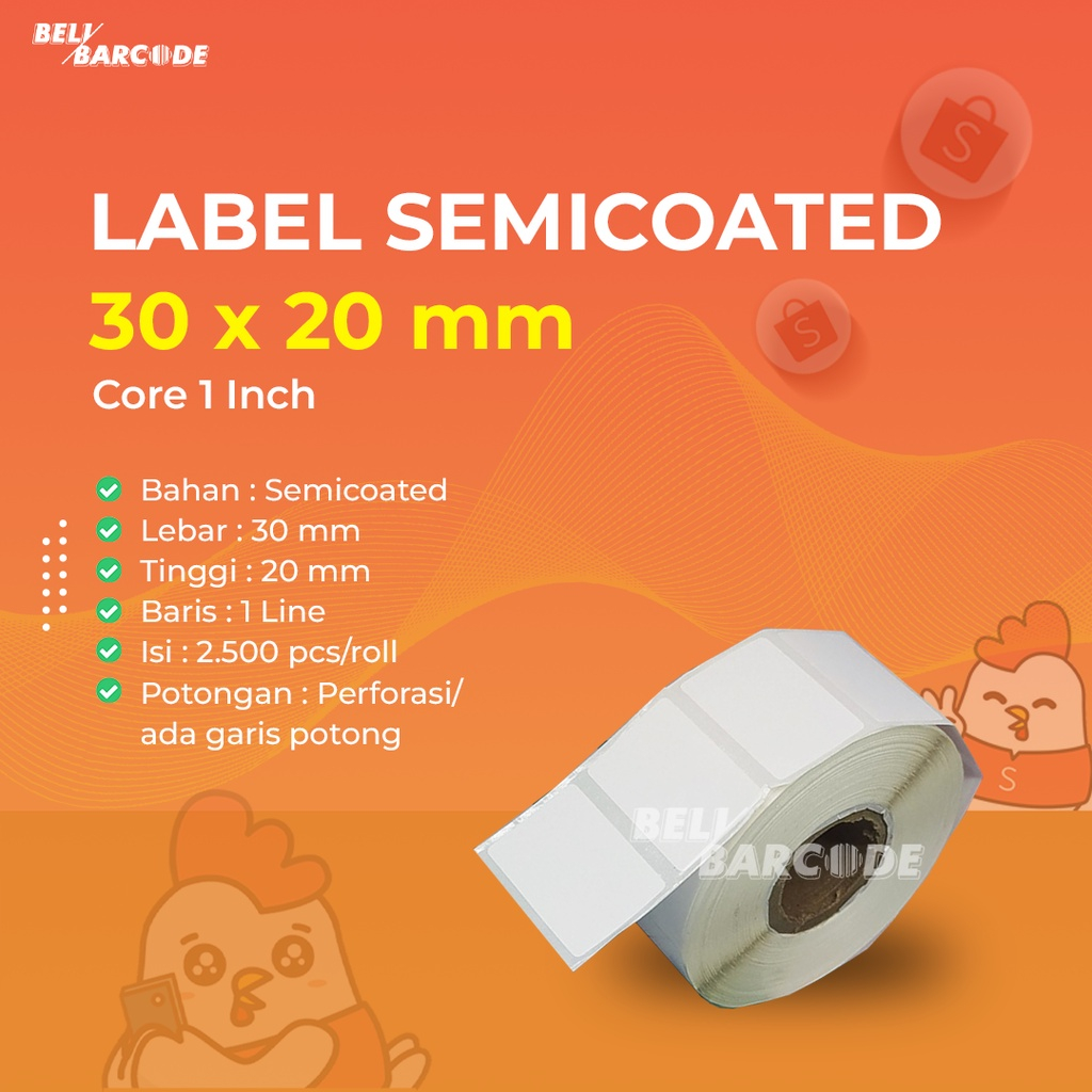 Informasi Produk : - Bahan : Semicoated - Lebar : 30 mm - Tinggi : 20 mm - Baris : 1 Line - Isi : 2.500 pcs / roll - Core : 1 Inch (Kecil) - Perforasi / Ada Garis Sobek - Gap Kanan Kiri Atas Bawah - Harga diatas tercantum untuk 1 Roll label - Berat diatas tercantum untuk 1 Roll label