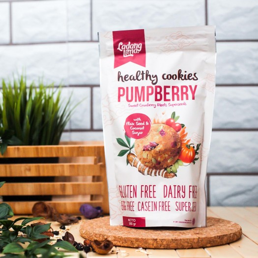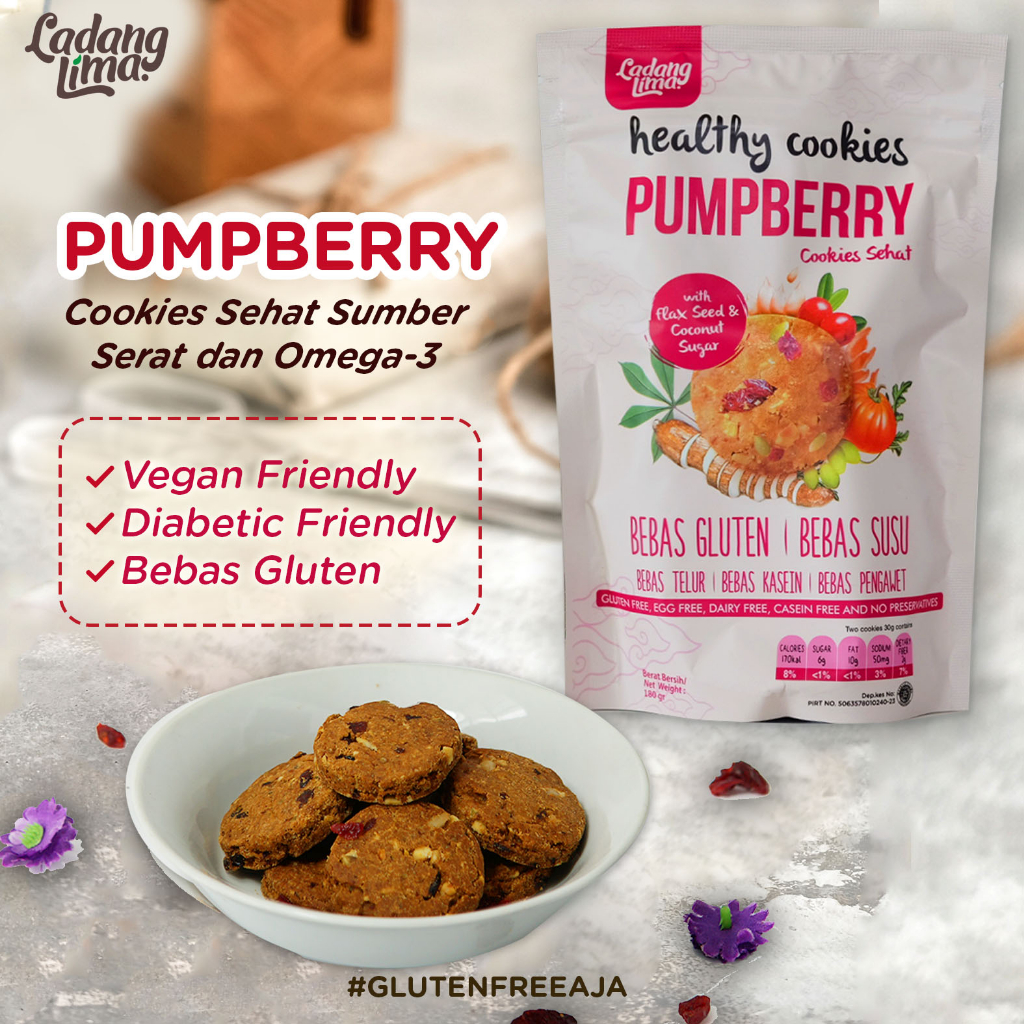 Cookies Pumpberry Gluten Free Ladang Lima "Sekali Hap! Bisa dibawa kemana aja!" ---------------------------------------------------- Perpaduan cranberry kering dengan aneka biji-bijian kaya nutrisi, kayu manis, dan tepung mocaf Ladang Lima. Membuat Pumpberry menjadi cookies yang memiliki rasa manis alami dan kaya akan manfaat. Cocok untuk kamu yang lagi diet/menerapkan pola hidup sehat. Cookies Ladang Lima juga bisa dikonsumsi oleh anak-anak lho!