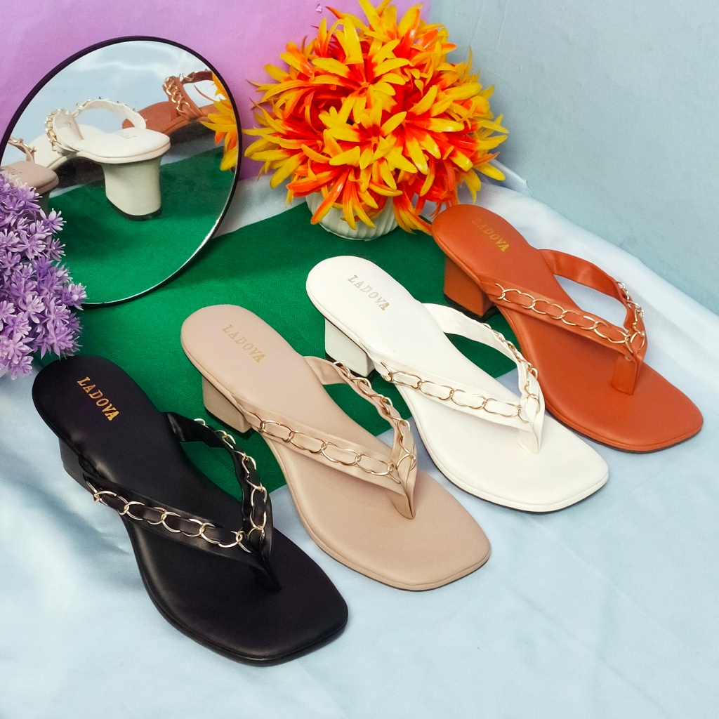 Detail Ladova - Sandal Heels Wanita Jepit Hak Chunky 5cm Nova Aksesoris Rantai Terbaru