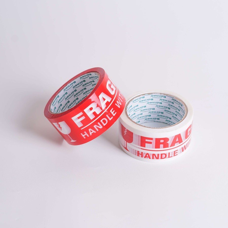 Specification: 1. Lebar x Panjang : 48 mm x 60 Yard 2. Warna : Merah (FRAGILE & JANGAN DIBANTING) 3. Ketebalan lakban : 48 micron 4. Bahan : Oriented Polypropylene Film 5. Quantity : 6 Roll/Slop , 72 Roll/Box