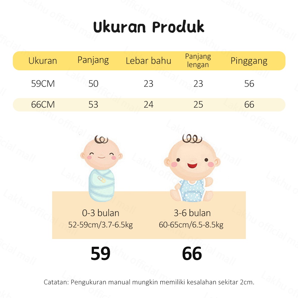 Ukuran: 🍒59cm ⭐Panjang: 50cm ⭐Panjang Lengan: 23cm ⭐Dada: 26cm ⭐Tinggi yang disarankan: 50-60cm ⭐Usia yang cocok: 0-3 bulan