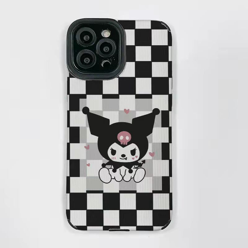 Handphone & Aksesoris > Casing & Skin > Casing & Skin Handphone > 【Lamb Skin】Black and White Checked Kuromi Soft Case for IPhone 6S 7 Plus 8 Plus X XS XR XS Max 11 13 12 14 PRO Max 14 Plus 12 13 Mini Camera Protect Women's Fashion Anime Cartoon