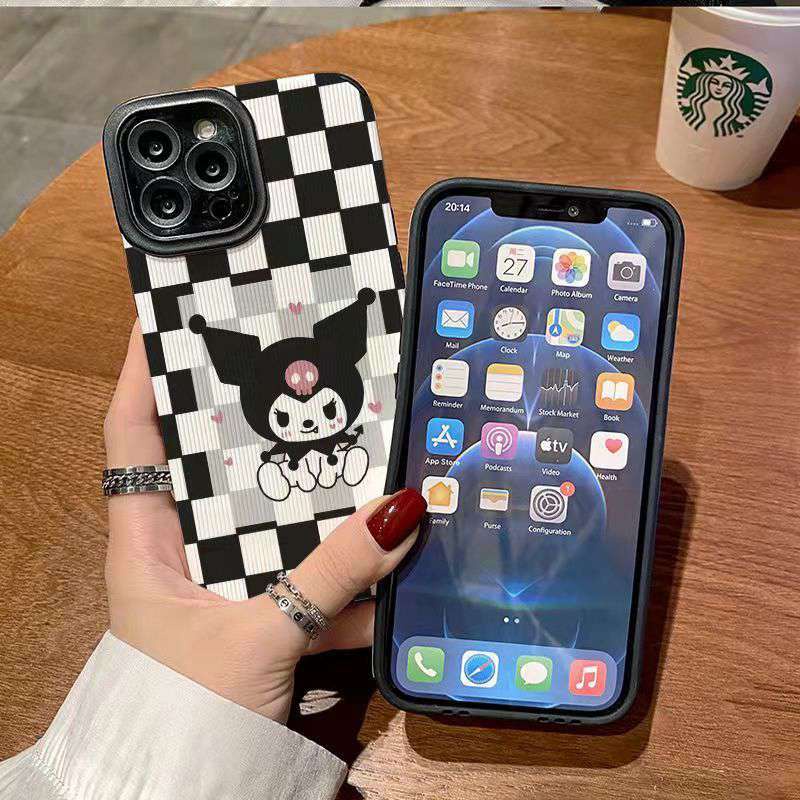 [Ready stock] 【Lamb Skin】Black and White Checked Kuromi Soft Case for IPhone 6S 7 Plus 8 Plus X XS XR XS Max 11 13 12 14 PRO Max 14 Plus 12 13 Mini Camera Protect Women's Fashion Anime Cartoon