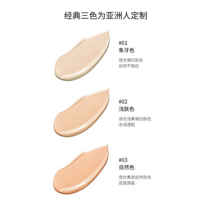 01# Ivory 象牙白 : Cocok untuk warna kulit pucat 02# Light Skin 浅肤色 : Cocok untuk warna kulit kuning muda hingga putih 03# Natural 自然色 : Cocok untuk kulit kuning langsat, atau warna kulit alami