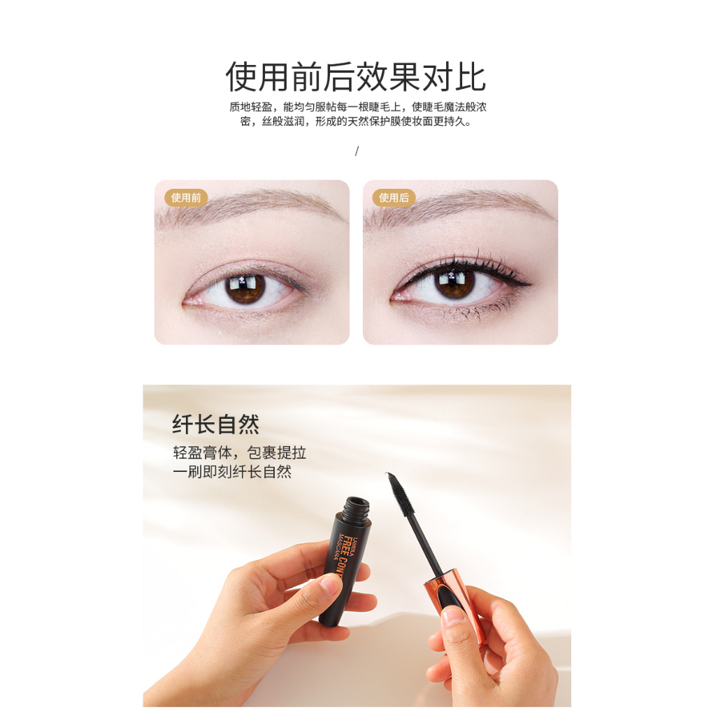 Maskara keriting panjang tahan air membuat bulu mata tebal dan lebat. Formula unik terbarunya dapat mencapai efek bulu mata yang lebat. Kualitasnya ringan dan dapat diaplikasikan secara merata pada setiap bulu mata, membuat bulu mata tebal dan ajaib. Bahan pelembab yang halus juga membentuk lapisan pelindung alami, membuat rambut halus, lembut dan elastis.