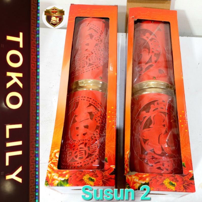 Lampu Lampion Imlek Berbentuk Lonjong (Tabung). Ukuran : Diameter 12 cm Panjang 23cm Tersedia dalam 2 Motif : Fu Bunga dan Fu Titik Tersedia dalam Varian: • Susun 1 • Susun 2 (Dimensi di kali 2).