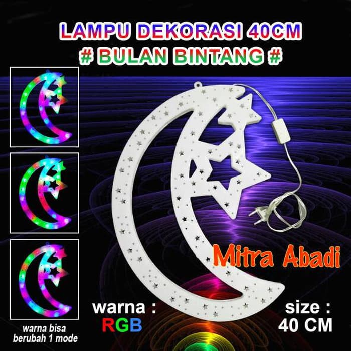 1. Nama barang : Lampu dekorasi Bulan Bintang 2. Ukuran : 40 cm 3. Power : 1 Watt 4. Tegangan : AC 220V 5. Jumlah led : 35 pcs 6. Mode kedip : 1 tipe 7. Warna : RGB
