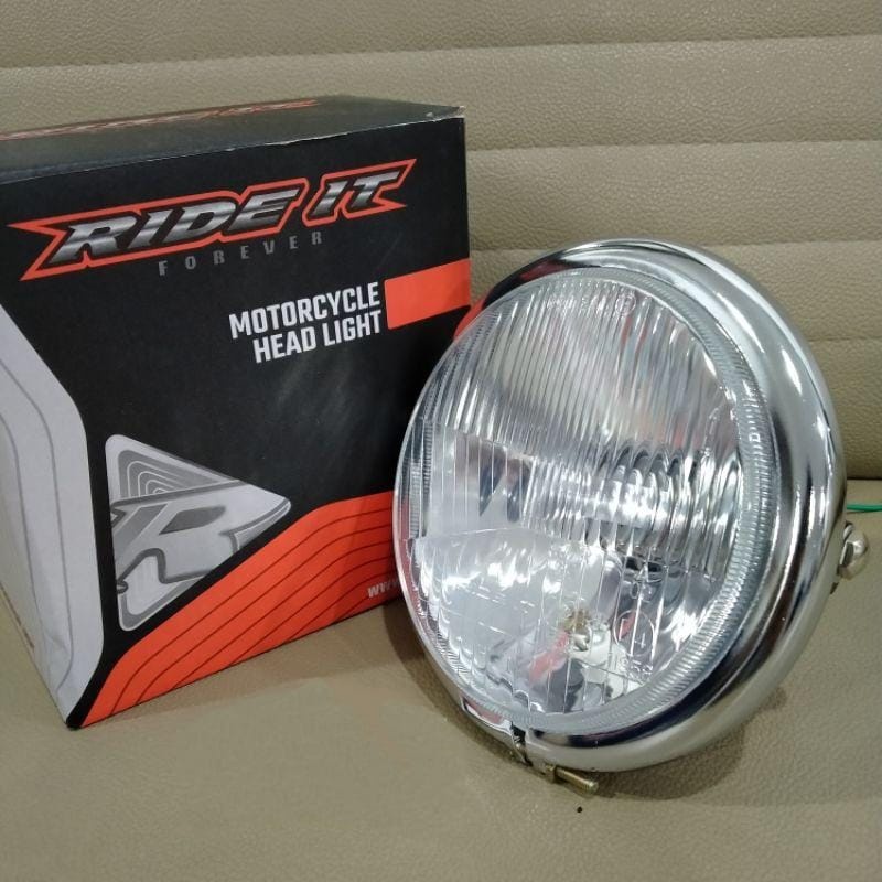 LAMPU DEPAN CB PESEK AUTOPAL (JUTE LED) - Merk : RIDE IT - Ukuran 5,75 inch - Diameter Luar 16 cm - Kaca Datar - Sudah Termasuk Bohlam Lampu H4 LED - Set Batok CHROME - Full Set assy (Batok, Reflektor, kaca, Bohlam, Soket h4, Baut kanan kiri)