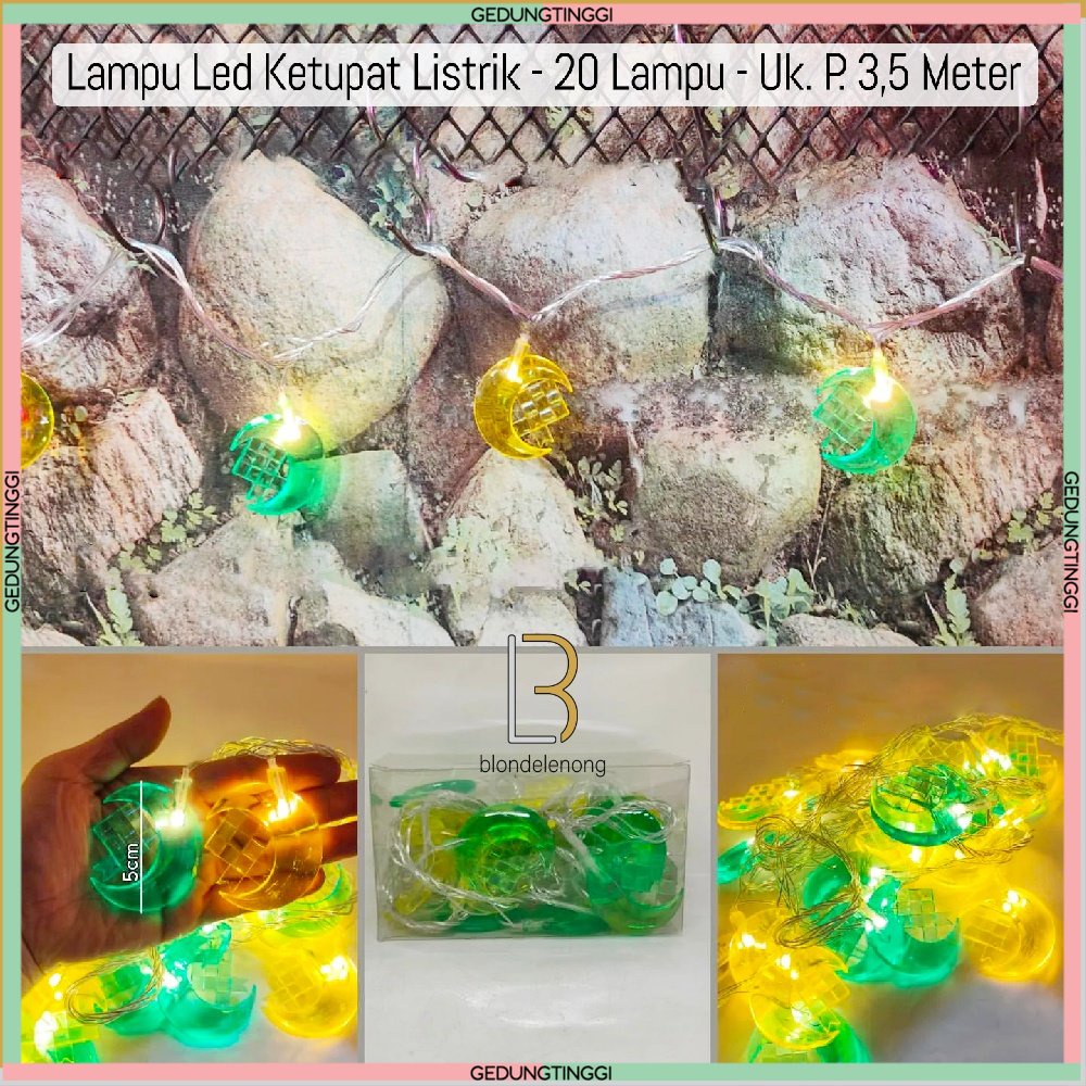 Panjang kabel 3,5 Meter Kabel Bening Transparan Uk : Cover Bulan Ketupat (P.5cm x L.2mm) Jumlah lampu ketupat : 20 pcs lampu menyala kedap kedip lampu bisa disambung-sambung cover bungkus mika