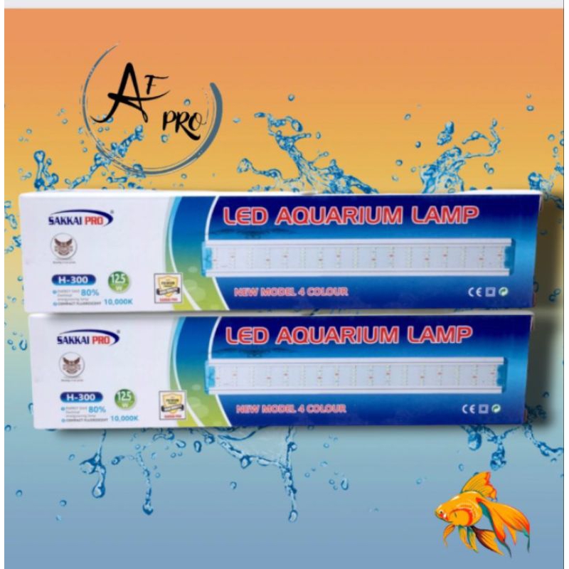 Merk SAKKAI PRO Type H-300 Daya 12,5watt Tegangan 220-240volt 6 baris titik LED sehingga warna yang dihasilkan terang Cocok untuk aquarium 30-40cm Dimensi 31x4x7cm Warna cahaya RED, GREEN,BLUE,WHITE