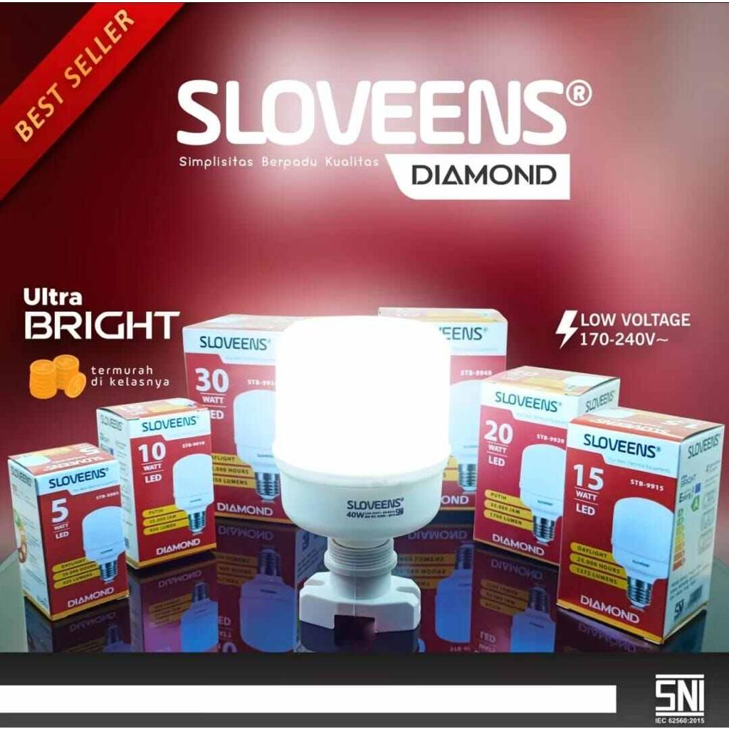 Merk : Sloveens Made in Indonesia Hemat Energi 80 % LED Bulb Cool Daylight 7000K Based E27 Fiting terbuka Tidak mudah pecah Pemakaian bisa di dalam dan di luar ruangan Nyaman di mata tidak beradiasi