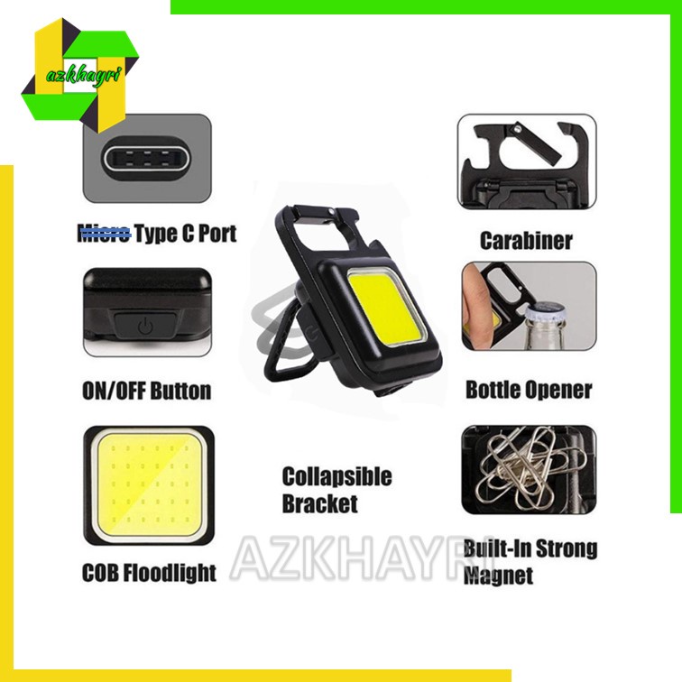Dengan Spesifikasi : - tekan tombol sekali nyala terangnya 60% mode redup nyala terangnya 30% - tekan tahan sampai 10 detik nyala full 100% super terang - Led COB memungkinkan cahaya sangat terang,dengan tipe cahaya menyebar - cas usb type c - 3 mode terang,redup,dan flash. - cas 1-2 jam full - mode on terus kuat sampai +- 4-5 jam - jarak jangkauan jauh hanya +- 8-10 meter karena cenderung menyebar dan dijamin super terang cahayanya - terdapat magnet dibelakang led bisa untuk servis mobil dan ditempel di kap tanpa harus dipegang terus. - bisa digantung layaknya gantungan kunci. - bisa di stand sesuai dengan keinginan - bisa digunakan sebagai pembuka tutup botol - waterproof - Dimensi Lampu 6 x 2 x 4,5 cm - berat 75gr