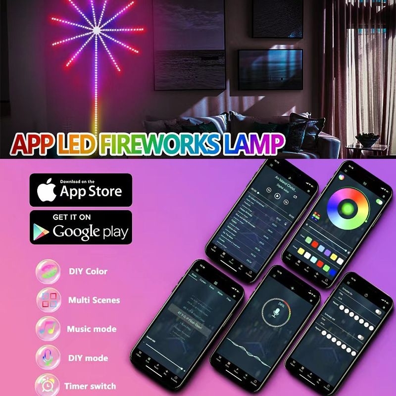 Specifications: Item type:Fireworks RGB LED Strip light Light Colors: Full color RGB, dream color changing LED Pixels Quantity:30LEDs/M Waterproof rate: Non- Waterproof Voltage:5V USB Length:0.5m SENSOR MUSIC BISA SAMBUNG APLIKASI Feature: It can be used for decorating your Dining room, Bedroom, Upstairs, Kitchen, Porch, Computer desk, Christmas tree, Bar and Living rooms, especially great for Holidays and Events like Christmas, Halloween, Parties, and more. It is a ideal gift for your family and friends. package 10 strips +1 strips LAMP+Lamp holder+Controller Note: After receiving the package, you need to assemble it yourself