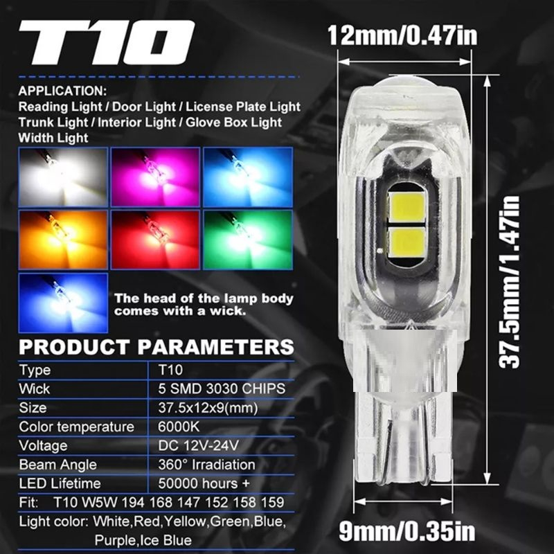 LED Type : 3030 Super Bright SMD LED Style : High Power LED Voltage : 12V (Non Polarity) Power : 5W Lumen : 600Lm (Each Bulb) Efficiency : 100% Casing : Alumunium Socket Type : T10 LED Quantity : 5 LED