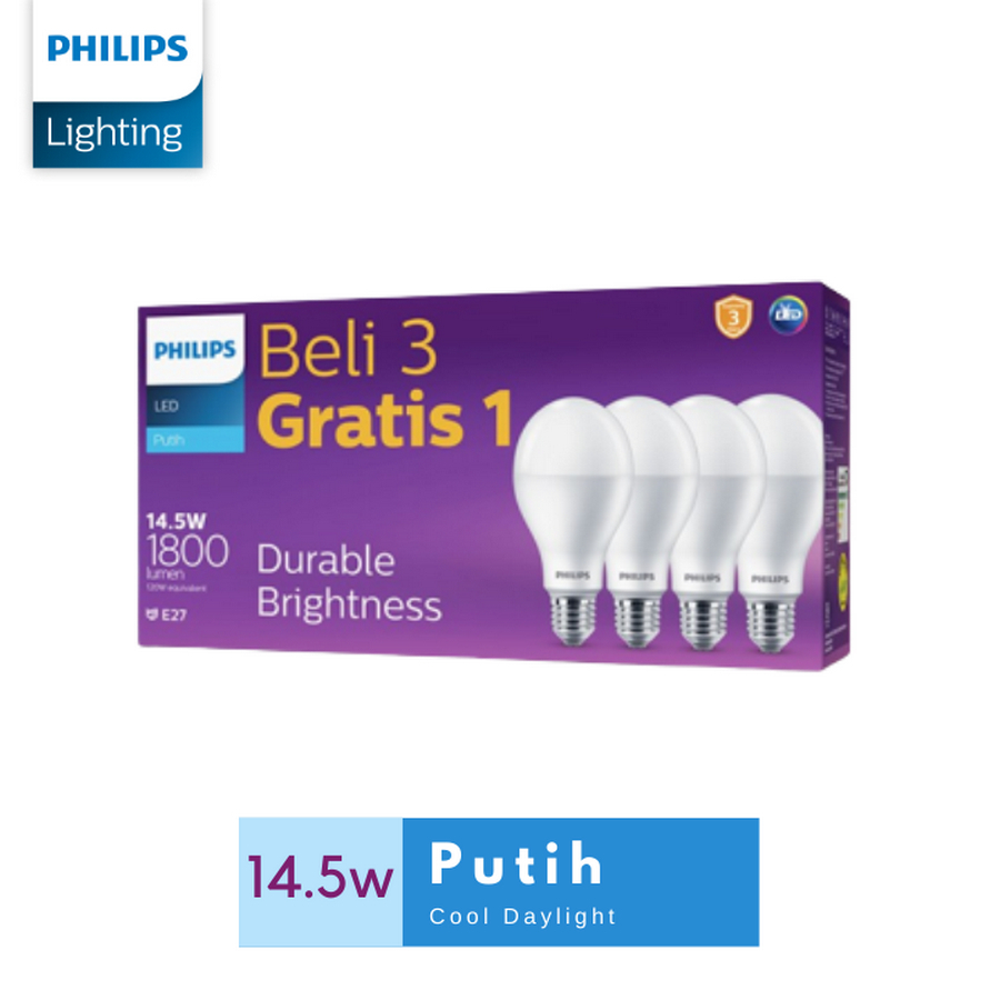 * Daya : 14,5 Watt * Voltase : 170 ~ 240 Volt * Lampu LED Philips 14,5w 1800Lumen * Setara : 27W CFL (Neon) atau 120W Bohlam Pijar * Cool daylight color * Longer lifetime - lasts up to 15 years * 85% energy saving * Garansi 2 tahun, Ongkir PP adalah tanggungan Pembeli. * Lampu ini juga lampu hemat energi.