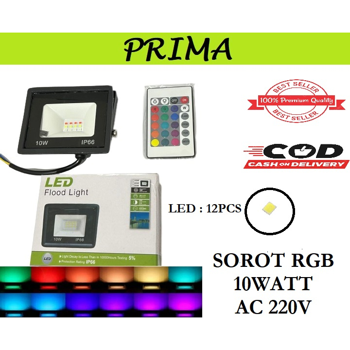 Spesifikasi: - Power: 50 Watt dan 100Watt - Hemat energi 80% - Warna: RGB warna warni - Beam angel: 120 - IP66 Outdoor Spesifikasi LAMPU LED SOROT RGB 10W - 10W SMD LED - IP65 Outdoor / Waterproof ( anti hujan ) - Hemat energi 80% - Warna : 16 Warna / RGB (Warna Warni) - Voltage : 90-240V - Lumen : 900lm - Life Span : 50.000 Hours - Ukuran : 10.5 x 8.5 x 2.3 cm Voltage : 220v ( AC ) Mata Led : Led SMD LED : 12 PCS Bahan : Alumunium