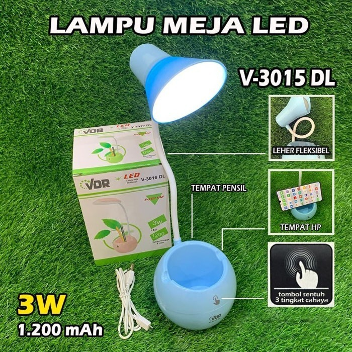 Merk : VDR Tipe : V-3015DL Lampu Meja Belajar 3 Watt Baterai 1200mAh Tahan Hingga 6 Jam Tombol Sentuh Leher Flexible Bisa di Putar Semua arah Warna : Hijau, Biru, Pink (Warna tidak bisa pilih, request silahkan namun bersedia terima stok yang tersedia) Bisa Juga Berfungsi Untuk Mati Listrik