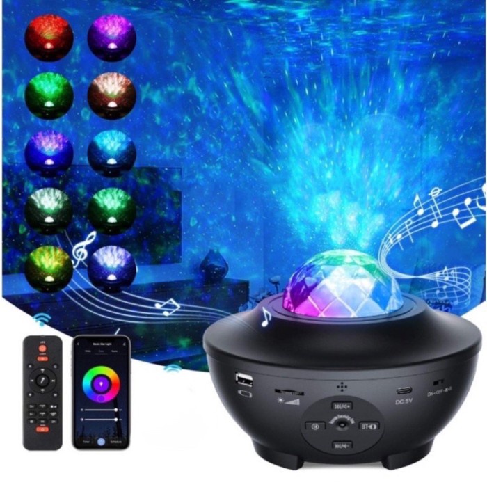 Fitur: - Memproyeksikan cahaya malam berbintang yang realistis, dapat berputar, pola dan warna cantik di langit-langit dan dinding sangat keren, menyinari kamar Anda yang gelap ke bawah air atau surga surgawi, yang sangat berguna bagi anak-anak yang tidak bisa tidur di kamar tidur yang tenang dan gelap untuk menjauhkan "monster". kecerahan bisa diatur, pengaturan minimum harus cukup redup agar orang tua tertidur, tetapi cukup terang agar bayi tidak panik dalam gelap. - [Remote dan kontrol suara dan penghitung waktu mati otomatis]: proyektor lampu malam gelombang laut remote control terbaru LBell dengan mode kedipan kontrol suara. Nyalakan / matikan bohlam secara bebas, ubah mode pencahayaan, siklus antara efek pencahayaan, sesuaikan kecerahan, mulai / hentikan gerakan, atau sesuaikan volume. Sensor gerak suara memungkinkan proyeksi untuk berubah warna atau bertepuk tangan sesuai dengan irama musik, menciptakan efek disko atau pesta. 3 opsi timer shutdown otomatis, built-in 1H / 2H / off. - Speaker musik dan slot USB mini internal, putar musik hipnotis favorit Anda melalui proyektor bercahaya, bersantai, bermeditasi musik, dan menonton Aurora Star di malam hari Awan dan galaksi, dan berkreasi suasana romantis dan menenangkan. Setelah menyalakan, Anda dapat menghubungkan ke ponsel atau perangkat lain