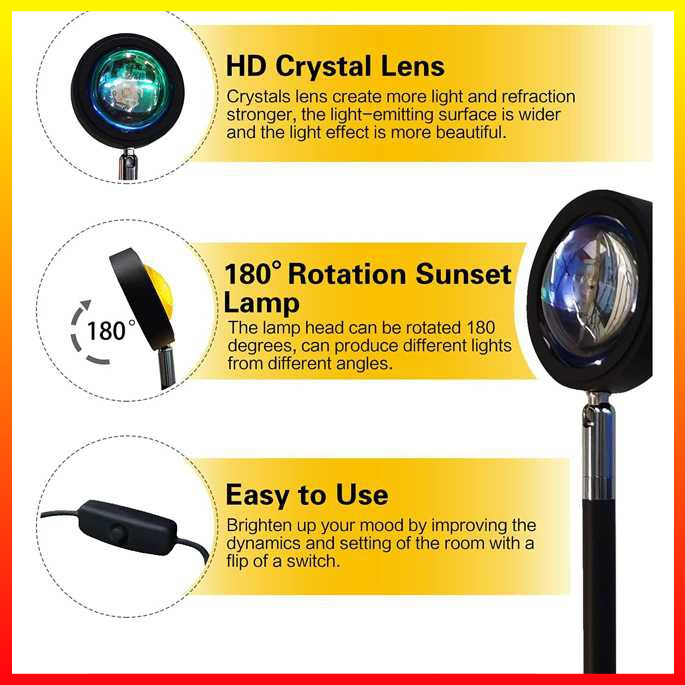 Spotlight Sunset Lamp Lampu ini memberikan efek golden sunset seperti efek terbenamnya cahaya matahari. Fungsinya seperti lampu sorot namun area cahaya lebih melebar ketika disorot ke dinding.