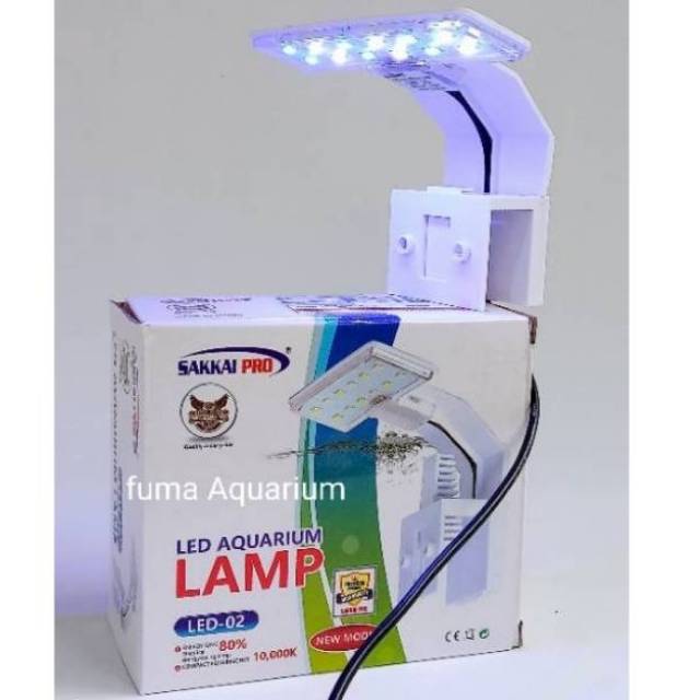 Merk: SAKKAI PRO Model : Led-02 jepit/clip Daya listrik: 3watt Nyala: 1.putih, 2. Biru, 3.putih biru Fit Aquarium: 20-40cm Dimensi: 18X13X6.5cm