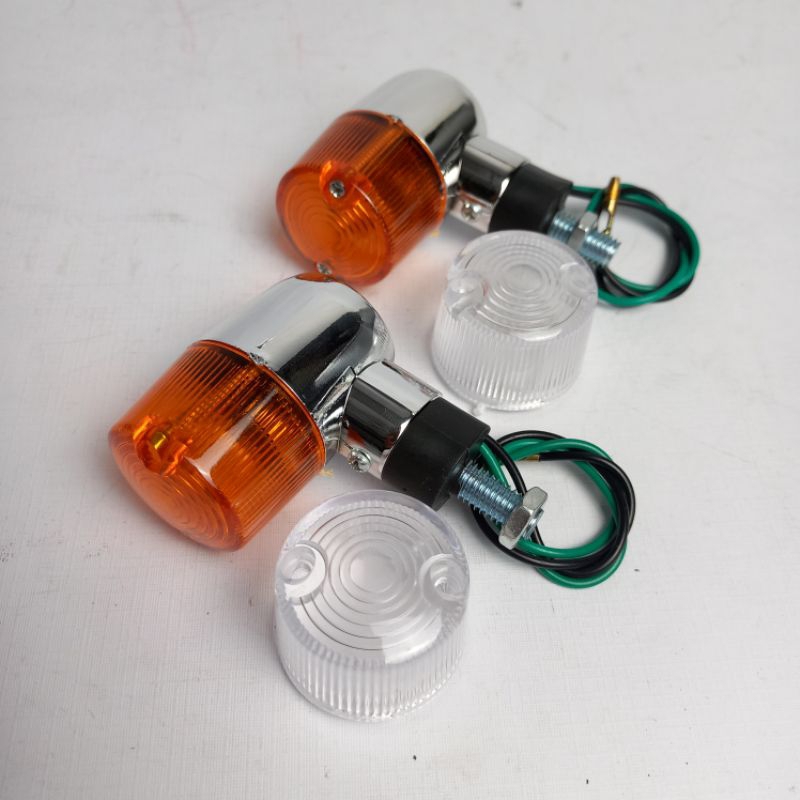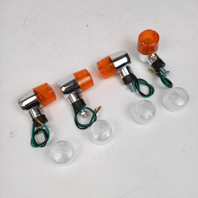 Lampu Sein CB Model Palu Bulat Bahan Plastik abs finishing Crhome Bisa pilih pesanan - 2pcs - 4pcs . doubel kaca putih&kuning / kaca kuning saja . cocok diaplikasikan ke semua motor (CB, GL, Tiger, Megapro DLL)