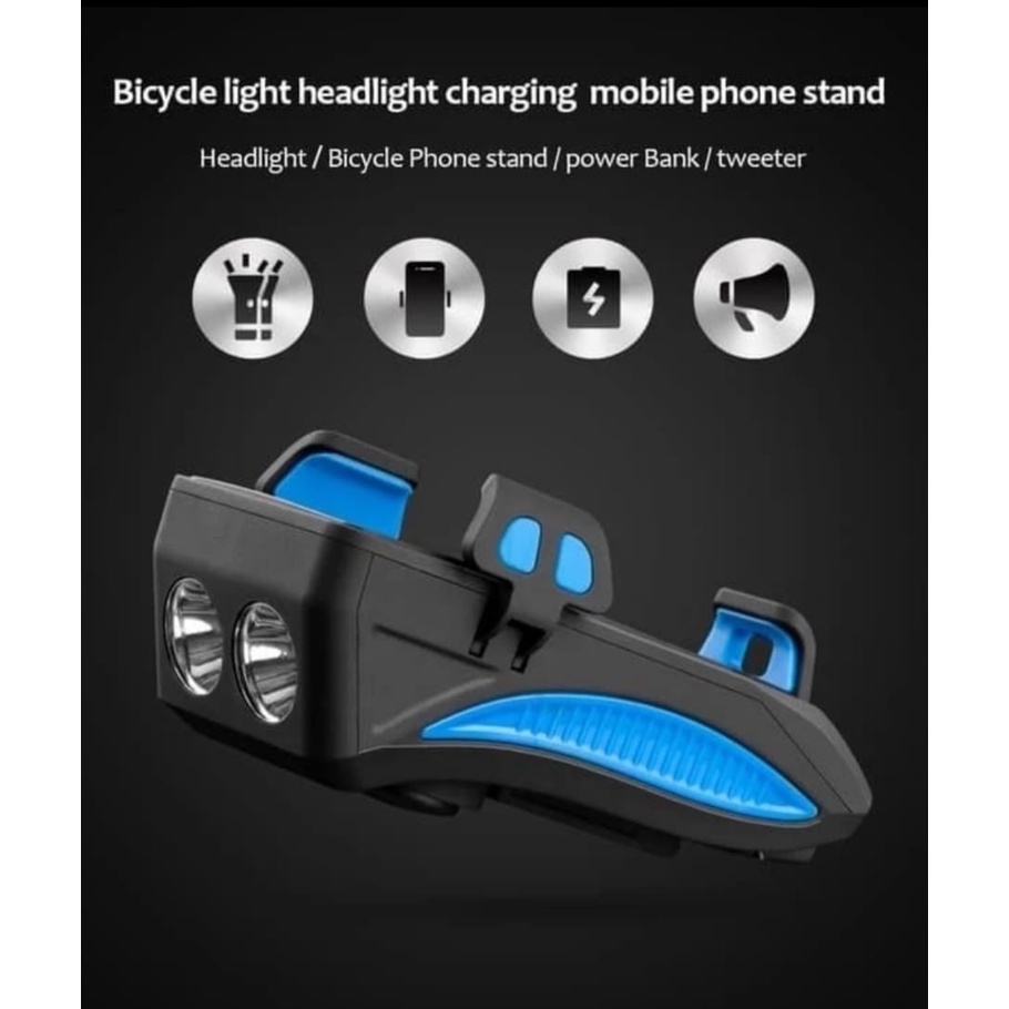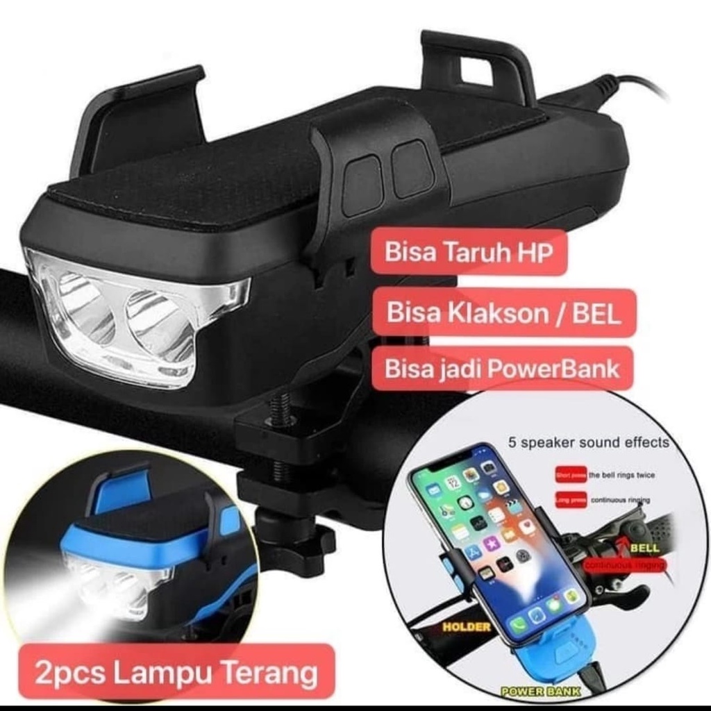 Lampu Sepeda 4 in 1 Banyak Fungsi : 1. Lampu Terang dan bisa Tahan 6 - 12 Jam 2. Bisa jadikan Holder HP / Tempat HP Aman Tidak akan Jatuh ada 3 sisi utk menahan 3. Bisa jadikan Power Bank 4. Ada Fitur Klakson Sepeda Kekuatan Suara 130dB (ada 5 Jenis Effect Suara Klakson cukup menekan selama 5 menit untuk mengatur suaranya.) 5. Lampunya ada 3 Light Modes / Bisa di Atur yakni glare, low light dan strobe. 6. Waterproof (Tahan Air Hujan) and Dustproof (Tahan Debu bisa dibersihin)