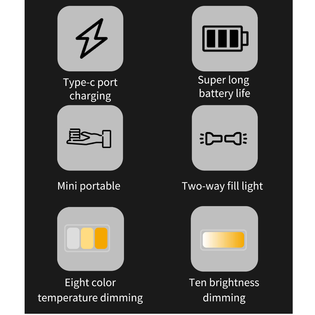 Ringkas Tanpa Kabel Pemakaian lampu kamera smartphone tidak memerlukan kabel daya karena telah dibekali baterai 500 mAh. Saat dayanya habis, Anda bisa mengisi ulang dayanya menggunakan pengisi daya type C yang tersedia.