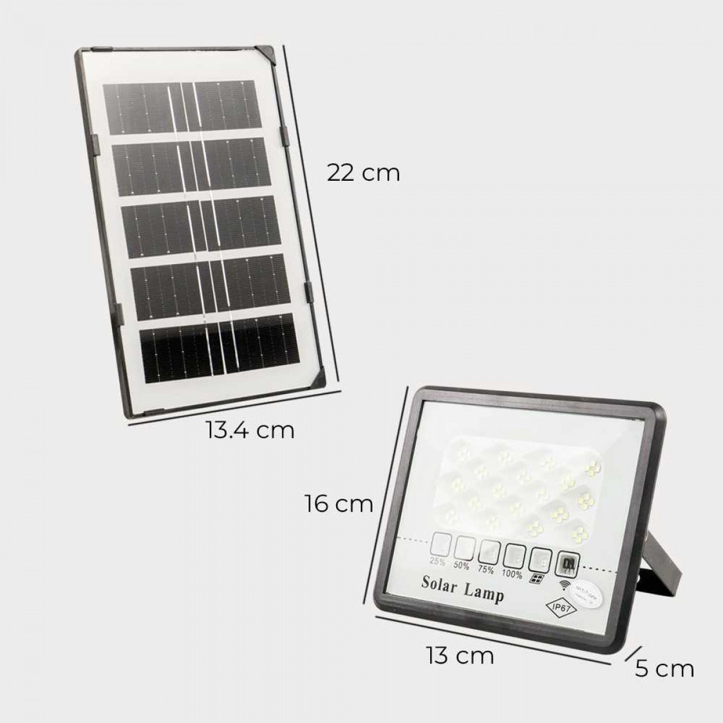 Spesifikasi Jumlah LED: 72 Voltase: 3 - 6 V Daya / Power 45 W Tipe Baterai Baterai Ni-MH Material Rangka Panel Surya: Plastik ABS Panel Surya: Polycrystaline Lampu: Plastik ABS Dimensi Lampu: 16 x 5 x 13 cm Panel Surya: 22 x 13.4 cm Panjang Kabel: Sekitar 4m Lain-lain IP Rating: IP66 Masa Pengisian Daya: 6 jam Jarak Kendali Remot: 10 meter
