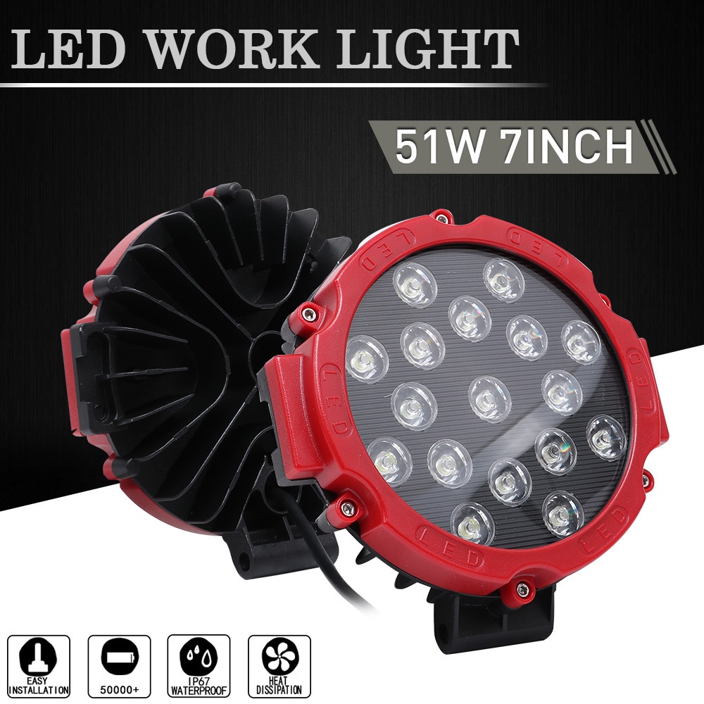 Spesifikasi: Suhu warna: 6000k putih Balok cahaya: balok banjir Ukuran: 7 inci dipimpin lampu kerja Bentuk: lampu kerja ronud Nilai daya: 51w Tegangan input: dc 12-36v (cocok 12v 24v) Kategori tahan air: ip67 Suhu kerja: -40 85 derajat celsius Sumber cahaya: 17 leds Fluks bercahaya: 8000lm Waktu: lebih dari 50000 jam untuk penggunaan normal Bahan perumahan: aluminium die-cast Aplikasi: ute, utv, atv, pickup, jeep, suv, offroad, perahu, truk