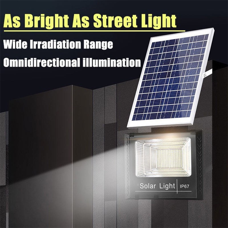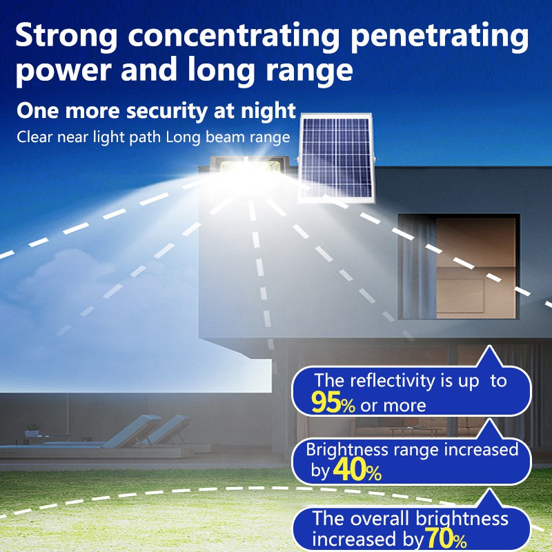 Lampu sorot keamanan surya dilengkapi dengan panel surya terpisah, Anda dapat memasang panel surya di luar ruangan untuk mengambil energi matahari, sementara perlengkapan itu sendiri dipasang dan memberikan penerangan di dalam ruangan.