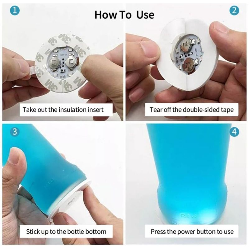 Sangat mudah digunakan.Cukup tempelkan ke botol normal atau kaca minum apa pun, dan klik tombol untuk menyala.