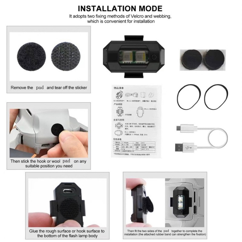 FITUR : - [dirancang Untuk pemosisian nyata UAV] bahkan di malam hari, cahaya yang mencukupi tidak akan mempengaruhi kinerja UAV. - [beberapa Warna] 4 warna dan mode berkedip dapat diatur secara bebas. - [transmisi Cahaya yang kuat dan jernih] juga dapat ditemukan 3 kilometer jauhnya. - [umur Panjang] masa pakai baterai hingga 6-8 jam dan waktu kerja panjang - [instalasi Mudah] diperbaiki dengan karet gelang atau dapat ditempel dengan Velcro