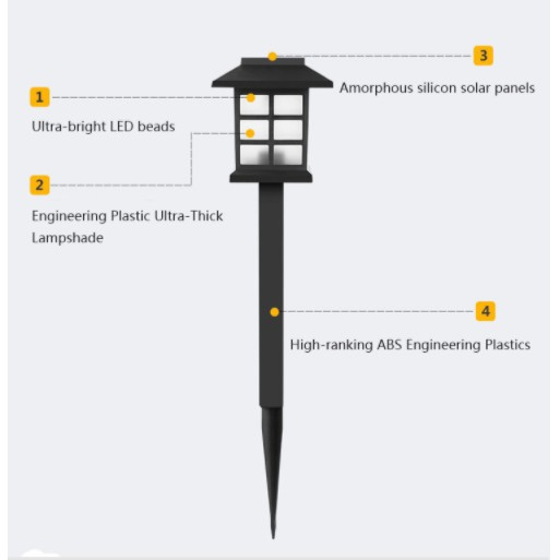 Fitur Lampu LED Lampu taman hias ini menggunakan lampu penerangan jenis LED sehingga mampu menghasilkan cahaya yang terang dan mampu memenuhi kebutuhan cahaya pada malam hari di luar ruangan.
