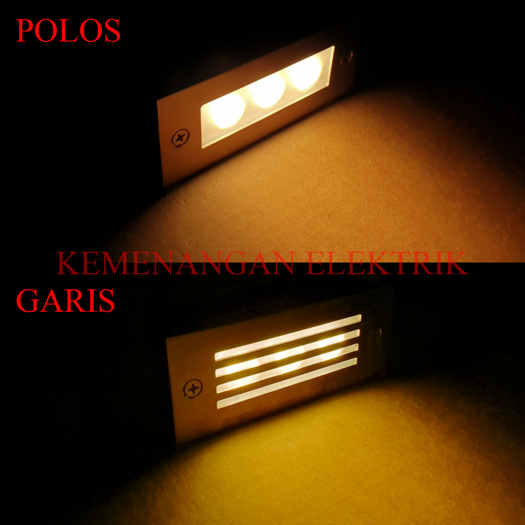 Cahaya : Warm White / White Daya : 3 Watt Jenis Lampu: LED 3 Mata Voltase: 220V Model Stainless: Panjang Polos / Panjang Garis Waterproof (bisa untuk outdoor & indoor)