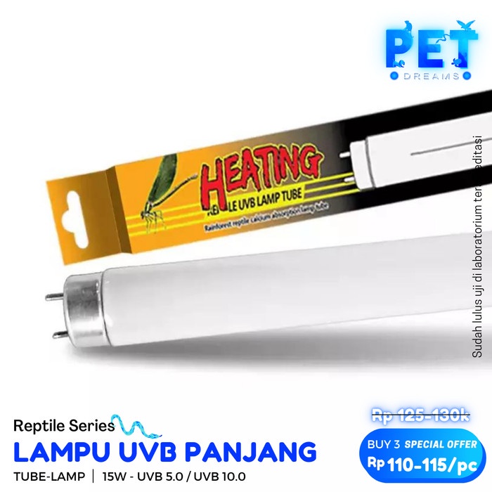 INFORMASI TAMBAHAN : Lampu uvb tube reptil hemat energi memiliki dua jenis 5.0 dan 10.0. 5.0 cocok untuk reptil hutan hujan yang tinggal di daerah subtropis, 10.0 cocok untuk reptil gurun di daerah tropis. Paparan harian 4-6 jam, berkontribusi pada sintesis vitamin D3 dan kalsium yang dikombinasikan untuk meningkatkan pertumbuhan tulang yang sehat dan mencegah penyakit metabolisme tulang.