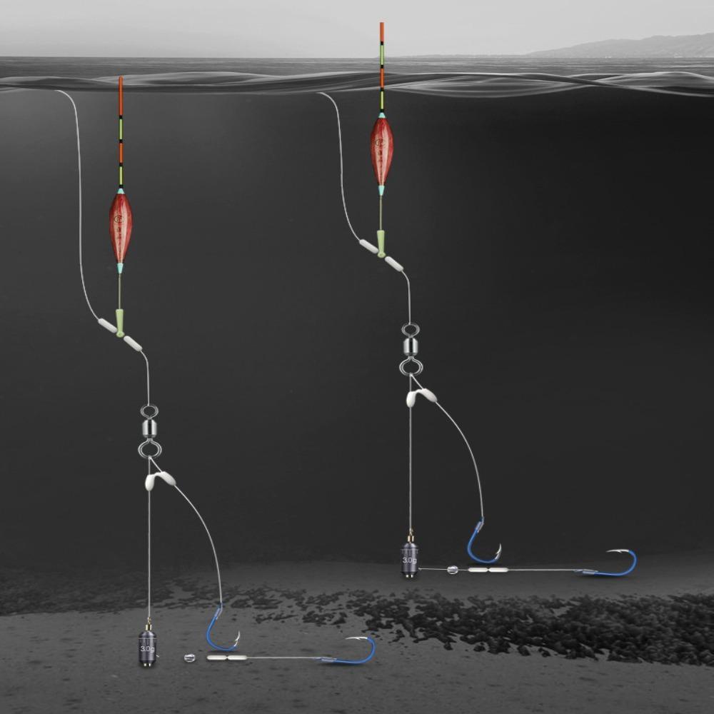 Desain kait ganda, dengan satu kait tergeletak di .an bawah dan satu kait tergantung. Meningkatkan kemungkinan menangkap ikan, kelompok garis sensitif, dan tahan terhadap migrasi air. Meningkatkan probabilitas menangkap ikan, kelompok garis sensitif, dan tahan terhadap migrasi air.