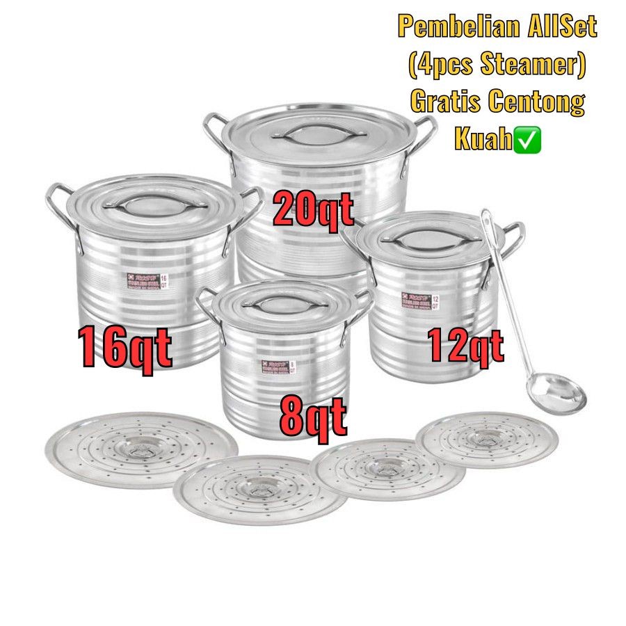 tersedia ukuran : 8 QT Diameter 20cm, Tinggi 17,3cm kapasitas 5,4 ltr dengan Steamer 12 QT Diameter 22,5cm, Tinggi 19,5cm kapasitas 7,3 ltr dengan Steamer 16 QT Diamater 25,3cm, Tinggi 21.3cm kapasitas 10,5 ltr dengan Steamer 20 QT Diamater 28cm, Tinggi 23,5cm kapasitas 14 ltr dengan Steamer