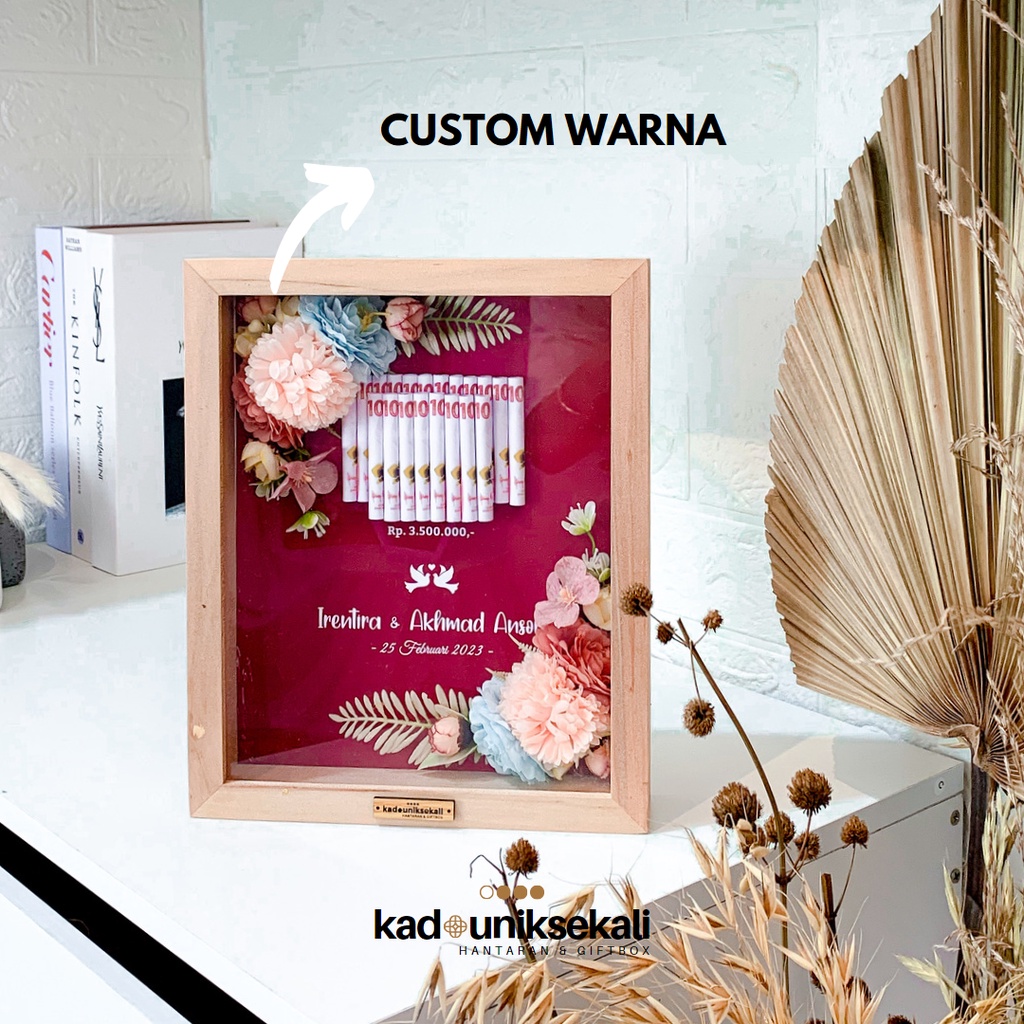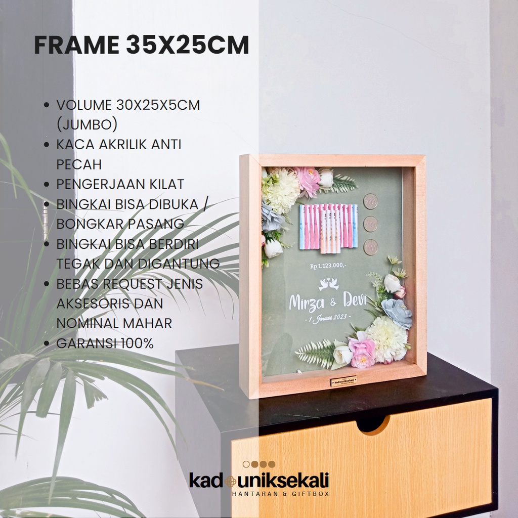 Detail Produk : - Frame Rustic / dari kayu natural - Frame bisa dibongkar pasang - Kaca Jenis akrilik 100% Anti Pecah - Rangkaian bunga tidak akan rusak dan tidak akan layu - Latar menggunakan print out kertas photo premium glossy - Bebas Request tulisan dan jumlah mahar - Harga sudah termasuk semua Aksesoris yang ada didalam bingkai