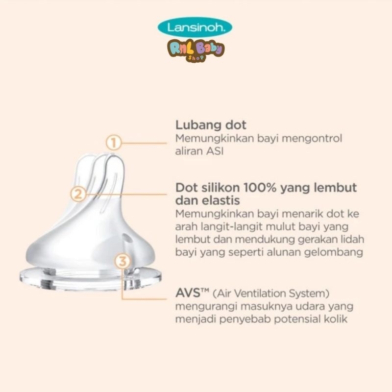 Membantu mempertahankan pola menyusu yang telah terbentuk sehingga mudah untuk beralih dari menyusu melalui payudara ibu ke penggunaan botol dan kembali menyusu melalui payudara ibu. Dot yang lembut dan fleksibel membantu bayi menyusu dengan nyaman.