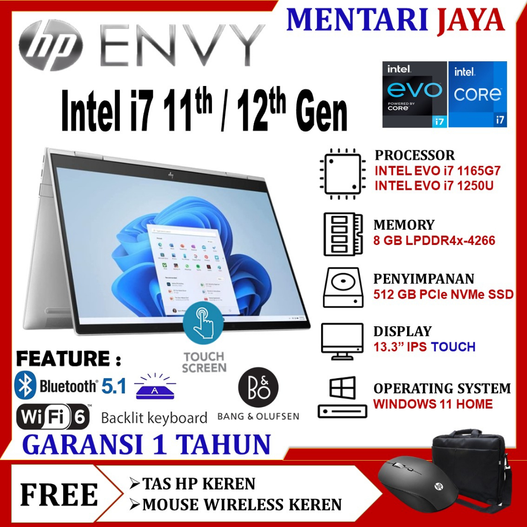 SPESIFIKASI : - Processor: - Intel Core i7-1165G7 11th Gen 12M Cache, up to 4.70 GHz, with IPU - Intel Evo platform powered by 12th Generation Intel Core i7-1250U