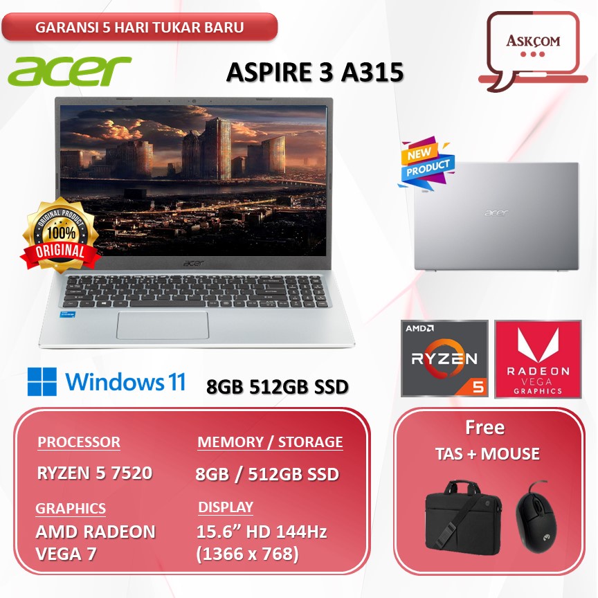 Spesfikasi: • CPU : AMD Ryzen™ 5 7520U CPU Cores 4, Threads 8, 2.8GHz Up to 4.3GHz • OS : win 11pre • LCD : 15,6" HD 1366 x 768 resolution Acer ComfyView™ • Memory : 8GB LPDDR5 Dual Channel • Storage : 512 GB SSD NVMe • Graphic : AMD Radeon™ 610M • Bluetooth : Bluetooth® 5.0