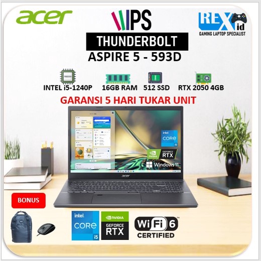 DETAIL SPESIFIKASI : • CPU : Intel® Core™ i5-1240P Processor 1.7 GHz (12M Cache, up to 4.4 GHz, 4P+8E cores) • OS : Windows 11 Home • LCD : 15,6" display with IPS (In-Plane Switching) technology, Full HD 1920 x 1080, high-brightness Acer ComfyView™ LED-backlit TFT LCD • Memory : 8 GB / 16 GB DDR4 Memory • Storage : 512 GB SSD PCIe Gen3, 8 Gb/s ,NVMe • Graphic : NVIDIA GEFORCE RTX 2050 (4GB GDDR6) • Bluetooth : Bluetooth 5.2 • Wifi : Wi-Fi 6E with MU-MIMO • Camera : HD webcam with: 1280 x 720 resolution; 720p HD with Temporal Noise Reduction Blue Glass Lens • Speaker : Acer Purified.Voice technology with two built-in microphones. Compatible with Cortana with Voice • I/O Port : HDMI® port 2.0 with HDCP support 1x USB 3.2 Gen 1 (with power off charging features) 2x USB 3.2 Gen 1 1x Thunderbolt 4 1x RJ45 • Features : Thunderbolt, AI Noise Reduction, HD TNR • Keyboard : Backlight Keyboard • Security : Smart Fingerprint (on touchpad) --------------------------------------------------------- GARANSI : 2 TAHUN ACER INDONESIA (SERVICE DAN SPARE PART) GARANSI TOKO 5 HARI DI HITUNG DARI BARANG DITERIMA BARANG 100 % ORIGINAL