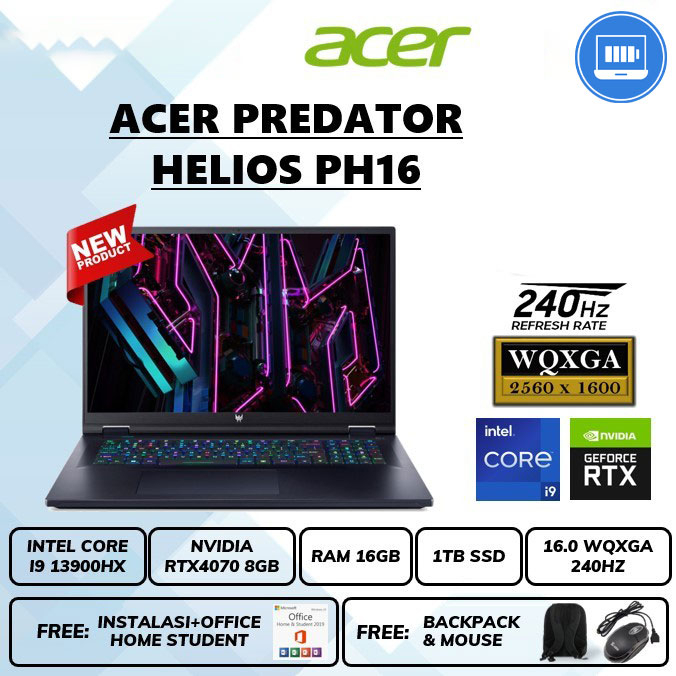 SPESIFIKASI : * Processor : 13th Gen Intel® Core™ i9-13900HX processor (36MB cache, up to 5.40Ghz) * Display : 16” 16:10 WQXGA (2560x1600) IPS 500 nits, DCI-P3 100% Display,supporting 240Hz, G-Sync * Memory : 16GB (2x8 GB of DDR5 5600Mhz) * Storage : 1TB SSD PCIe NVMe * Graphics : NVIDIA® GeForce® RTX4070, 8GB GDDR6 VRAM * Keyboard : Per-key RGB mini-LED keyboard * Wireles : Killer™ Wifi 6E and Killer™, Bluetooth 5.2 * Camera : 1080p Camera * Audio : DTS® X:Ultra Audio, featuring optimized Bass