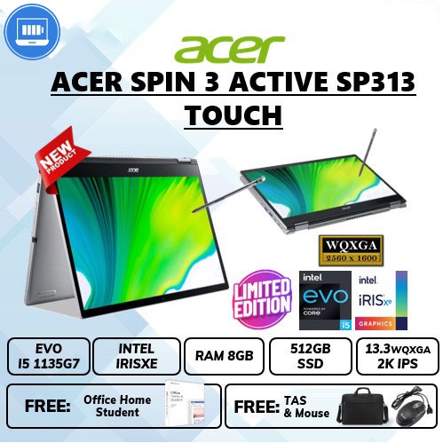 Detail Laptop ACER Spin 3 Active 2in1 touch evo i5 1135g7 Ram 8gb Ssd 512Gb