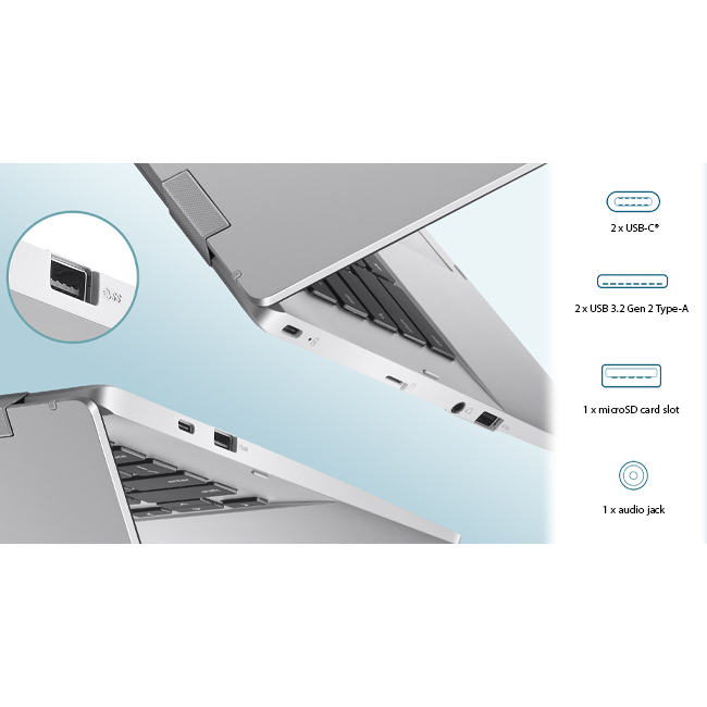 ** Ports : 2x USB 3.2 Gen 1 Type-A 2x USB 3.2 Gen 1 Type-C support display / power delivery 1x 3.5mm Combo Audio Jack Micro SD card reader