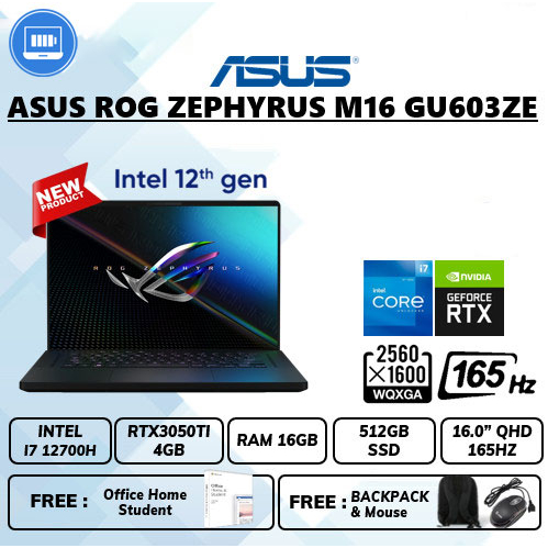 Detail Laptop Asus rog zephyrus m16 gu603ze rtx3050ti 4gb i7 12700h ram 16gb ssd 512gb 16"