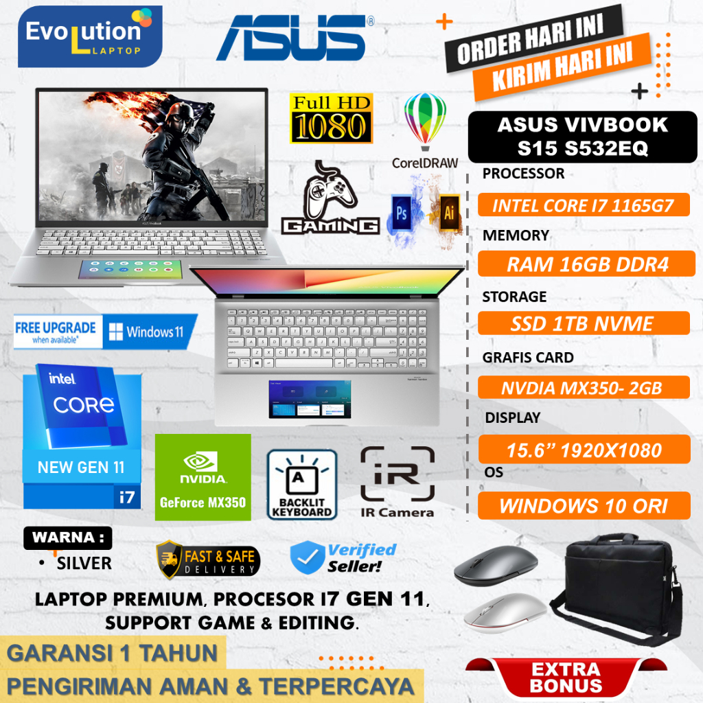 SPESIFICATION Processor : Intel Core i7 11th Gen (2.80GHz Up To 4.70GHz) CPU L3 Cache 12 MB RAM : 16 GB DDR4 DDR4 Storage : 1TB PCIe SSD Graphics : NVIDIA GeForce MX350 2GB DDR5 Display : 15.6FHD (1920 x 1080) 250 nits, Anti-glare, 45% NTSC Operating System : Windows 11/10 Home 64bit Original