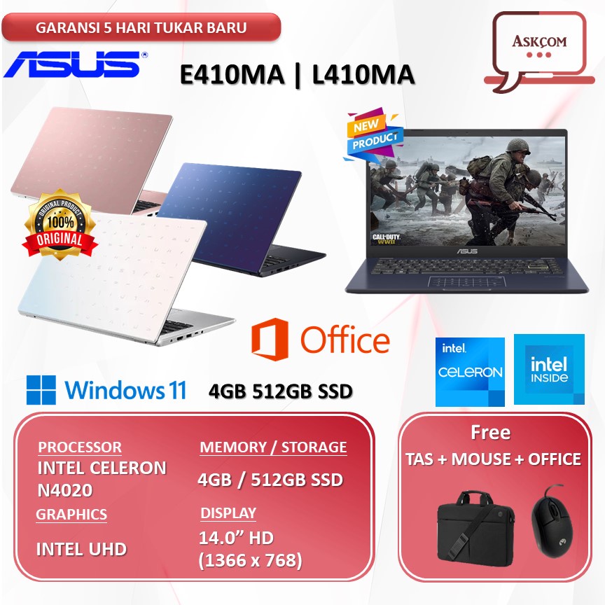 ASUS E410MA N4020 4GB 192/320 SSD W11+OFF365 1YR 14.0 WARNA : - BLUE - BLACK - PINK