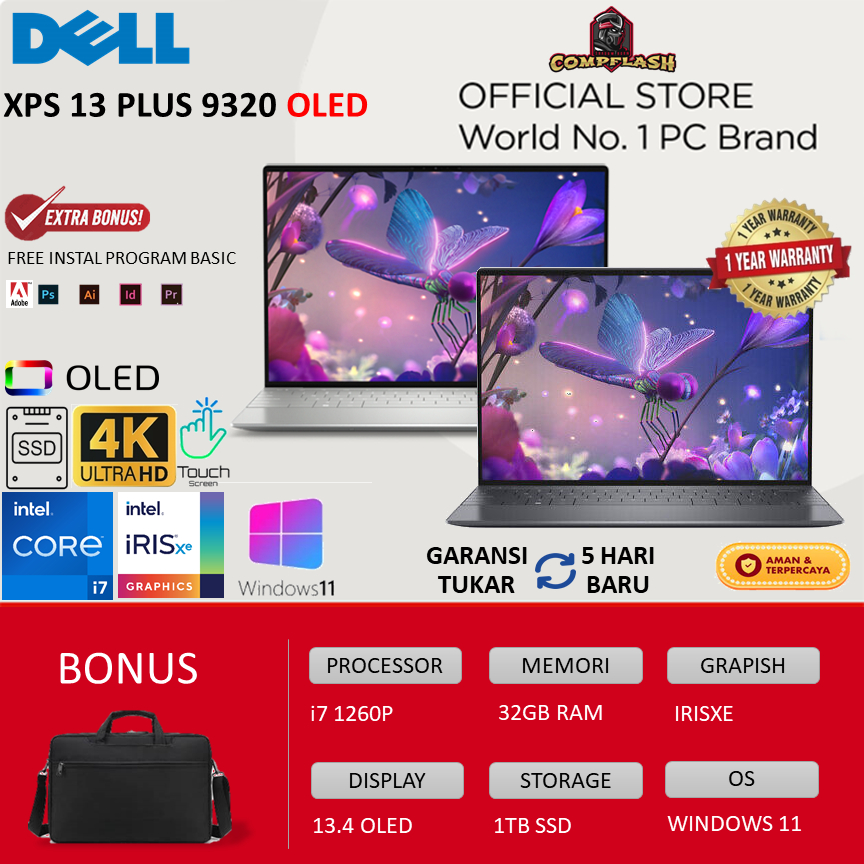 Spesifikasi lengkap : Processor : 12th Gen Intel Core i7-1280P (24 MB cache, 14 cores, 20 threads, up to 4.80 GHz Turbo) Display : 13.4", UHD+ 3840x2400, 60Hz, Touch, Anti-Reflect, 500 nit, InfinityEdge Memory : 32 GB, LPDDR5, 5200 MHz, integrated, dual-channel Storage : 1 TB, M.2, Gen 4 PCIe NVMe, SSD Graphics : Intel Iris Xe Graphics Wireless : Intel® Killer™ Wi-Fi 6E 1675 (AX211) 2x2 + Bluetooth 5.2 Wireless Card Camera : 720p at 30 fps HD RGB camera, 400p at 30 fps Audio : Dual stereo speakers