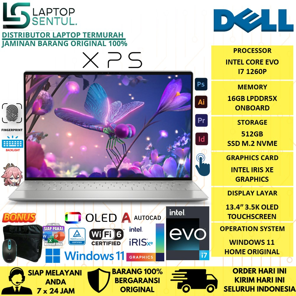 Detail Laptop Dell XPS 13 Plus 9320 Intel EVO i7 1260P 16GB DDR5 512GB Iris Xe 3.5K Oled Windows 11 Home Original